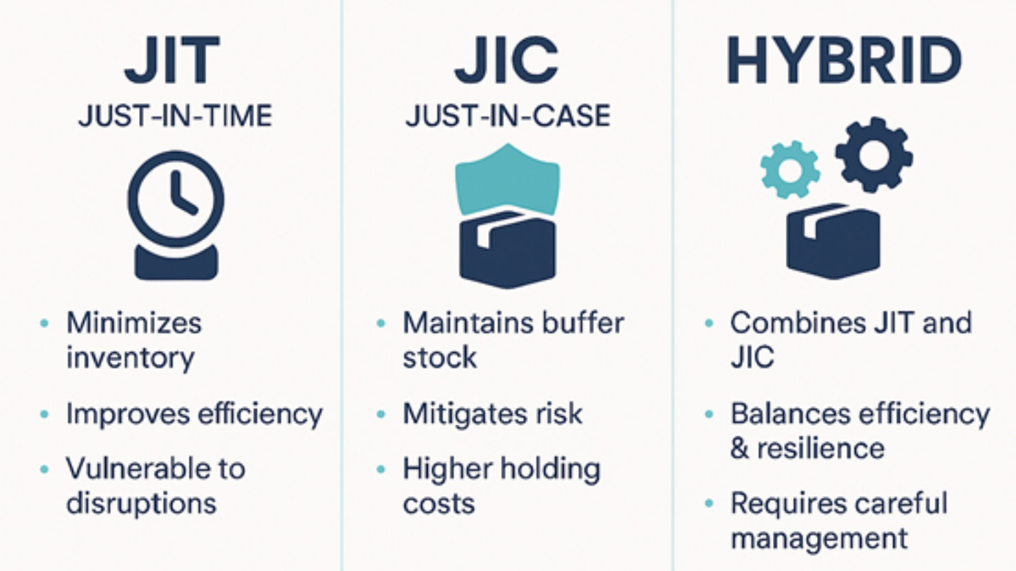 Many companies have adapted to JIT’s shortcomings by shifting to a hybrid model of combining JIT with strategic stockpiling.[ii] They hold larger stocks of key materials or components to boost their resilience against possible shortages.